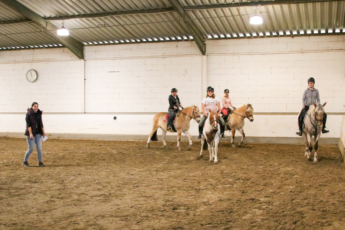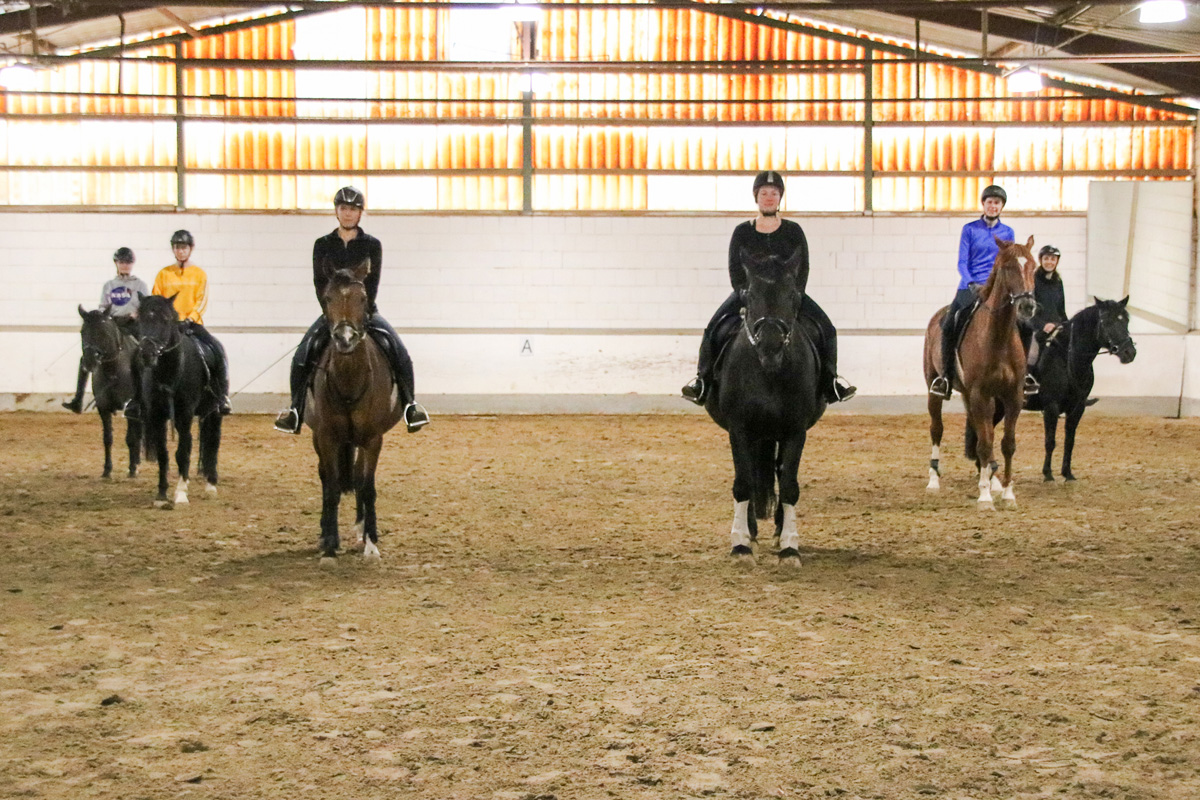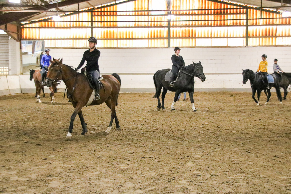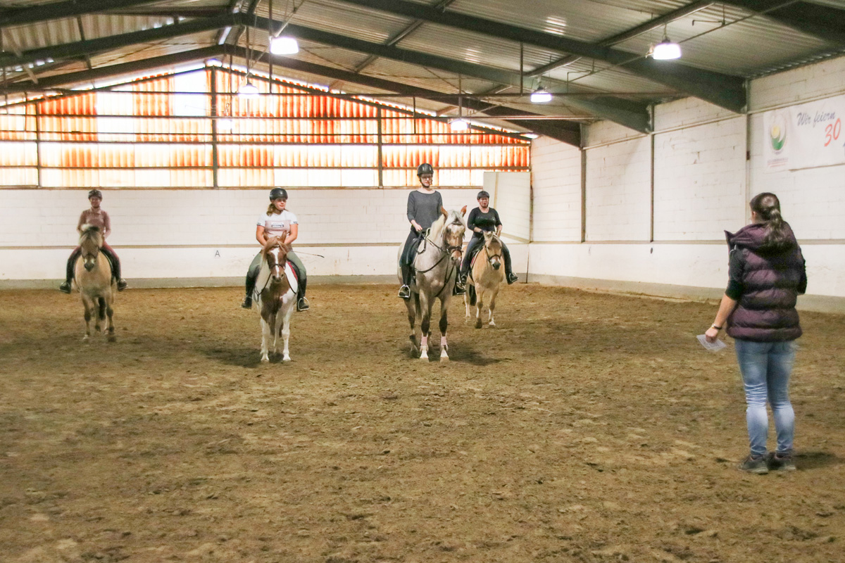 Obwohl Kursleiterin Julia Winkelmann zum ersten Mal auf dem Wiesenhof zu Gast war und weder Reiter noch Schulpferde kannte, war sie bestens vorbereitet - sogar eine Gruppen-Einteilung hatte sie auf Basis der Informationen, die sie von der Organisatorin des Kursprogramms, unserer Vereinsvorsitzenden Katrin Förster, erhalten hatte, schon ausgearbeitet. Los ging es allerdings erst einmal für alle gemeinsam - trotz herbstlicher Temperaturen fand die Theorie in der Reithalle bei guter Belüftung und mit viel Abstand voneinander statt. Julia erläuterte die Besonderheiten des Quadrille-Reitens und erklärte verschiedene Schaubilder mit so klangvollen Namen wie "Glockenspiel" und "Rosengarten".