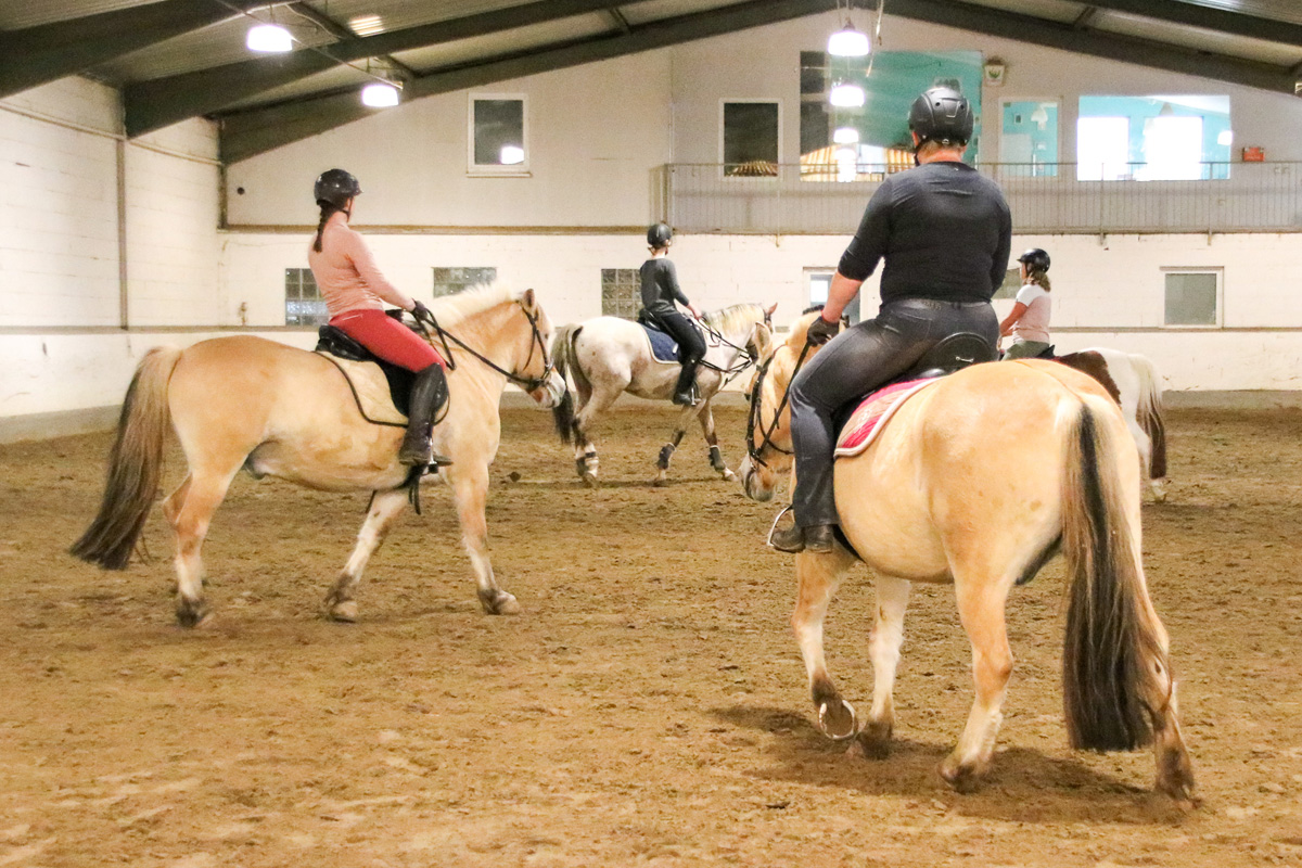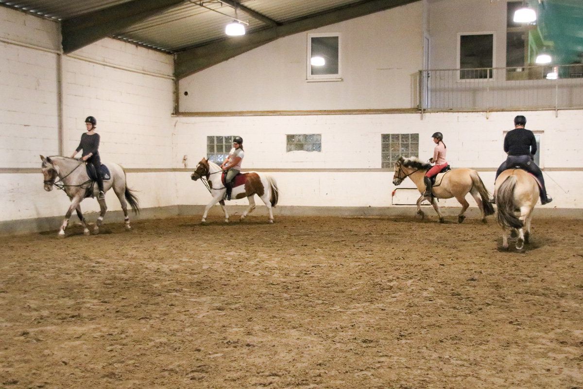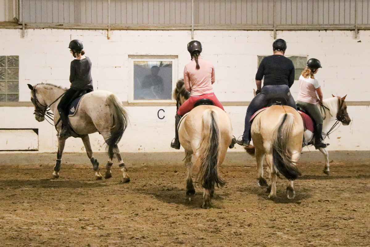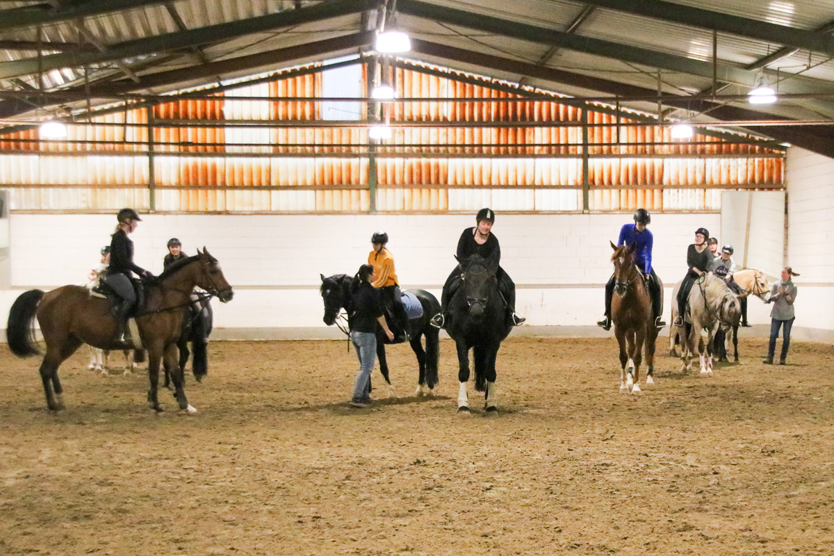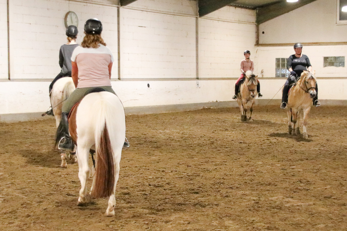 Obwohl Kursleiterin Julia Winkelmann zum ersten Mal auf dem Wiesenhof zu Gast war und weder Reiter noch Schulpferde kannte, war sie bestens vorbereitet - sogar eine Gruppen-Einteilung hatte sie auf Basis der Informationen, die sie von der Organisatorin des Kursprogramms, unserer Vereinsvorsitzenden Katrin Förster, erhalten hatte, schon ausgearbeitet. Los ging es allerdings erst einmal für alle gemeinsam - trotz herbstlicher Temperaturen fand die Theorie in der Reithalle bei guter Belüftung und mit viel Abstand voneinander statt. Julia erläuterte die Besonderheiten des Quadrille-Reitens und erklärte verschiedene Schaubilder mit so klangvollen Namen wie "Glockenspiel" und "Rosengarten".