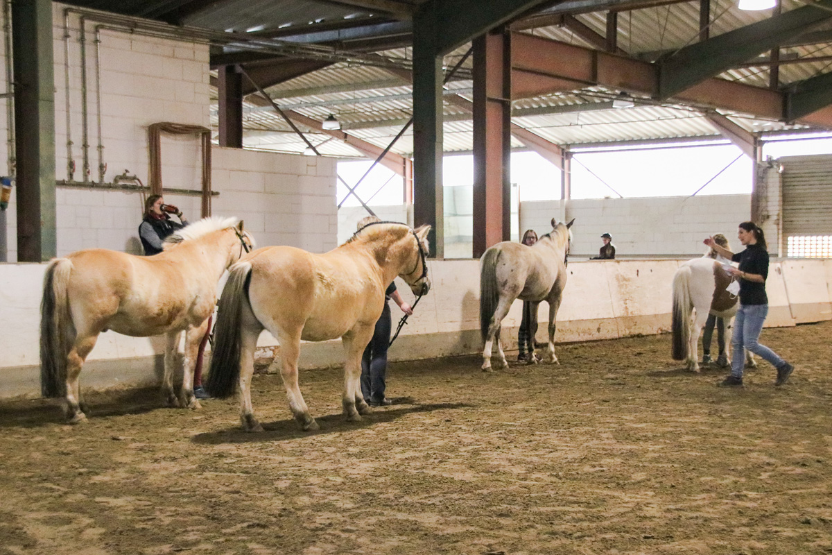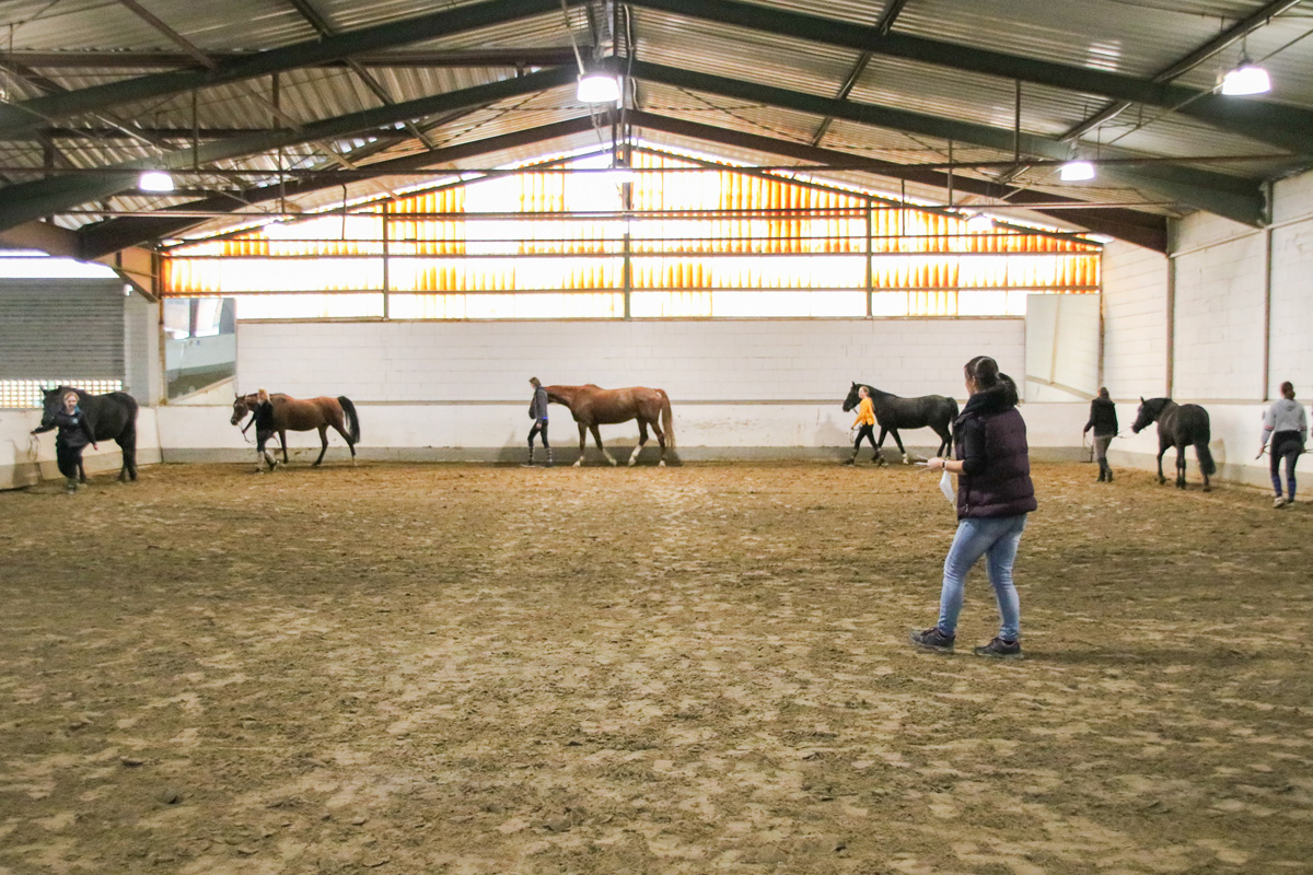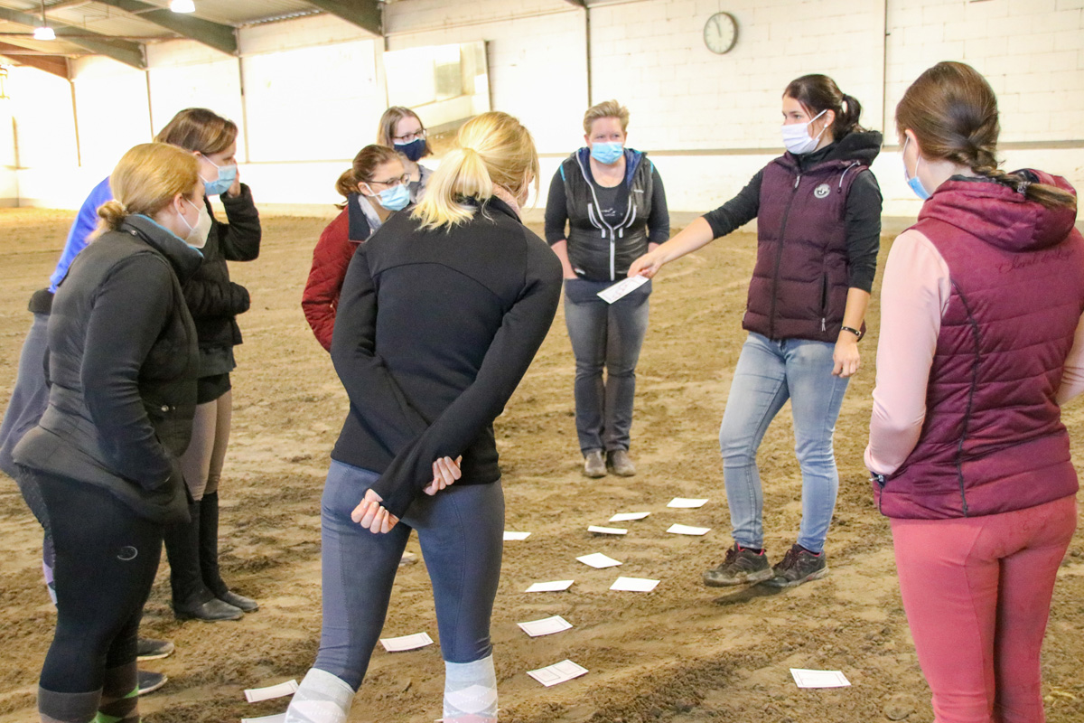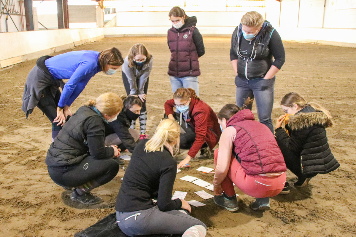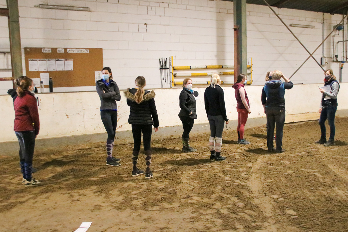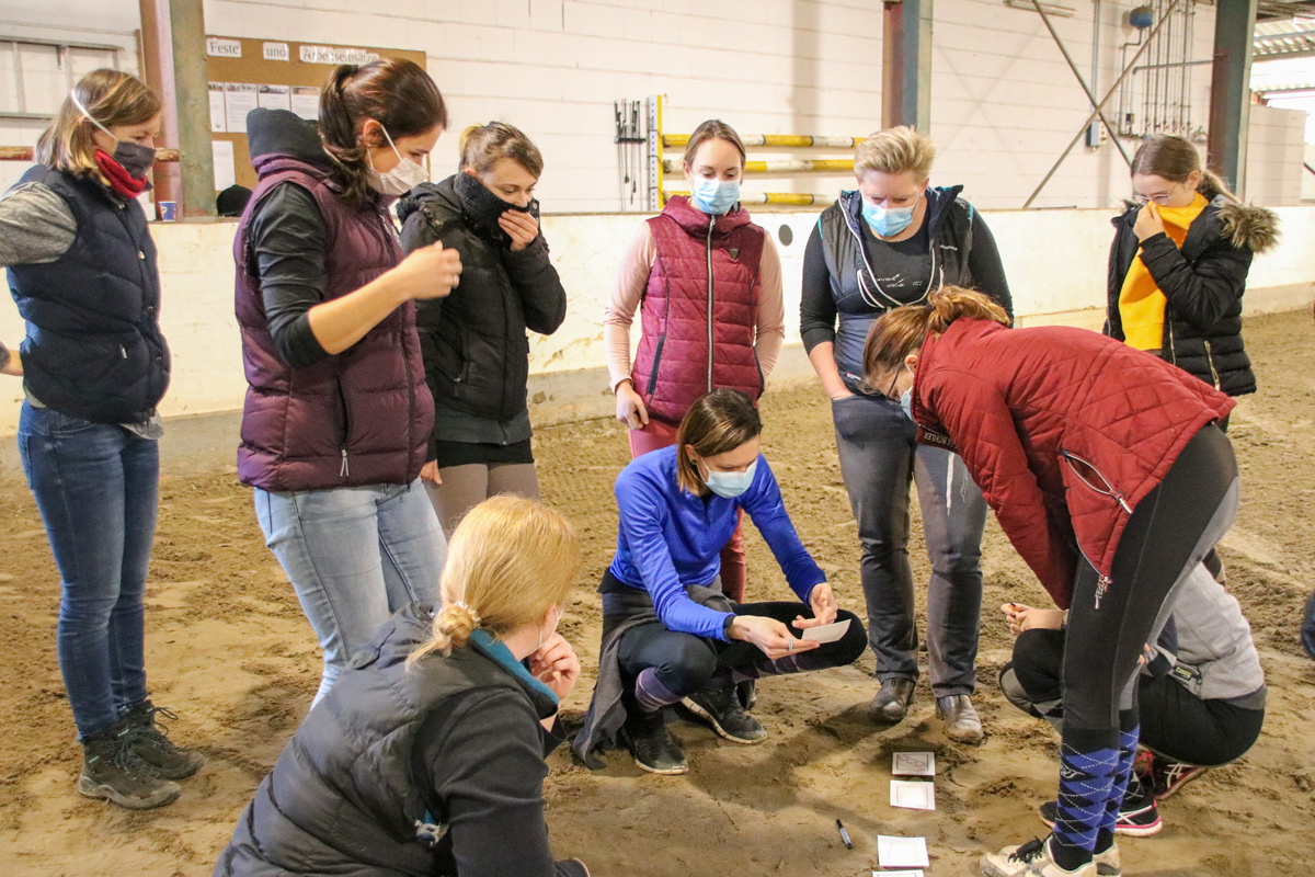 Julia bewahrte allerdings den Blick auf die Uhr und sorgte dafür, dass die Vereinsmitglieder rechtzeitig fertig wurden (und trotz Mundschutz nicht zu lange gemeinsam um die Kärtchen herumstanden), um noch vor der Mittagspause die Quadrille zumindest zu Fuß üben zu können - erst einmal ganz ohne Pferd, dann aber auch schon mit geführten Pferden. Die Uhr war am Ende des Kurses auch der einzige Kritikpunkt der begeisterten Teilnehmer: Der insgesamt fünfstündige Kurs war zu kurz, für einige der Übungen hätten die Teilnehmer sich mehr Zeit gewünscht. Nach der Kritik, dass sieben- oder achtstündige Tageskurse sehr zeitaufwändig und teuer sind, waren wir froh, dem Vorschlag von Julia für einen kürzeren Kurs folgen zu können - wir werden den Kurs beim nächsten Mal aber gern mit mehr Zeit anbieten.