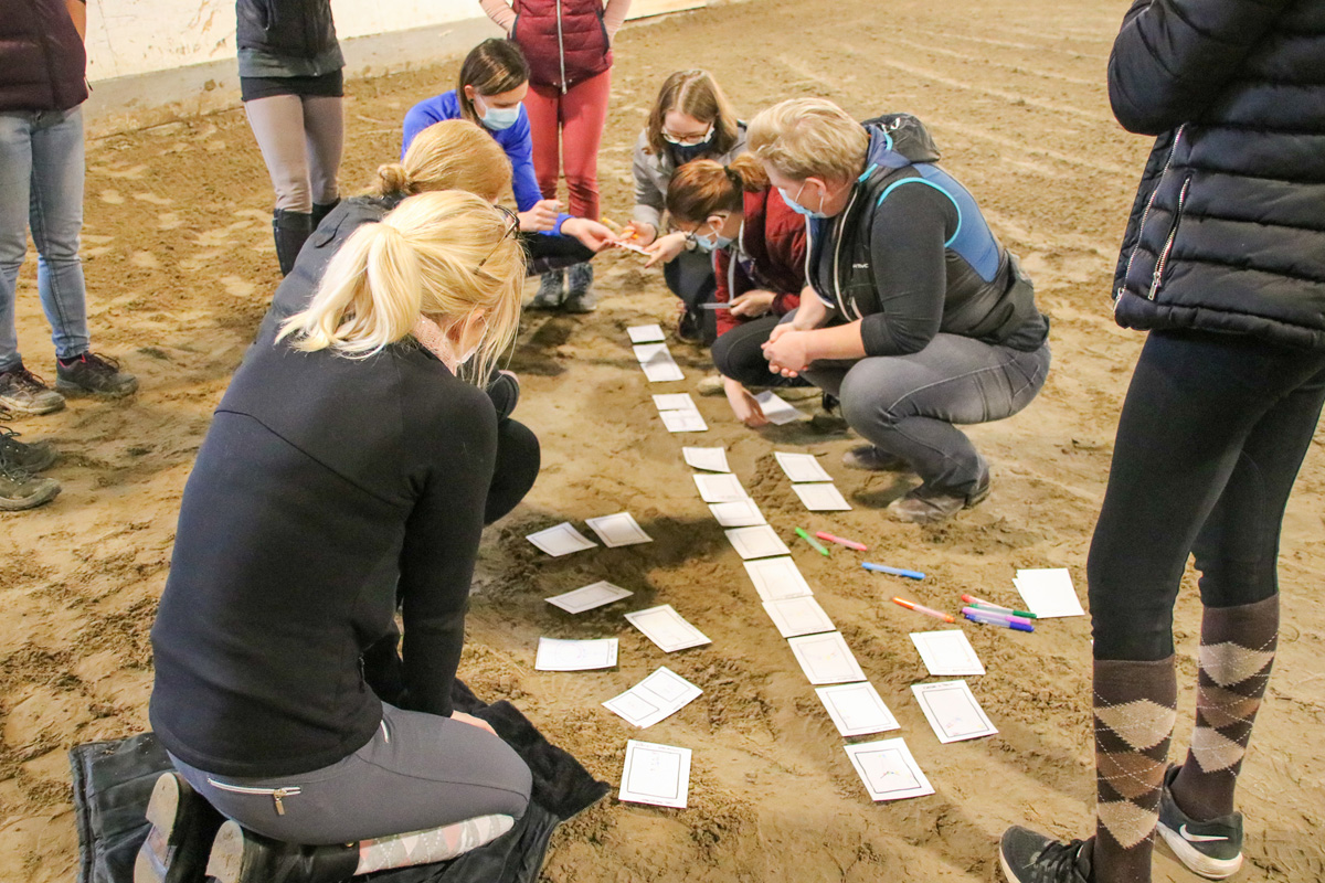 Im Anschluss daran war für die zehn Teilnehmerinnen Denksport angesagt: Sie sollten ihre eigene Quadrille entwerfen. Um dies zu vereinfachen, hatte Julia kleine Karten mit verschiedenen Schaubildern vorbereitet und jede Menge leere Kärtchen und bunte Stifte dabei, um den Vereinsmitgliedern Platz für eigene Ideen und Ergänzungen zu lassen. Coronabedingt waren die Diskussionen über den Ablauf der Quadrille ein wenig undeutlich hinter dem Mund-Nasen-Schutz der Teilnehmer, klar wurde aber schnell: Eine Quadrille zu entwerfen, die zeitlich im Rahmen bleibt, nicht zu komplex und vor allem auch in einer Form aufgebaut ist, dass sich jeder die aneinandergereihten Schaubilder merken kann, ist doch gar nicht so leicht.