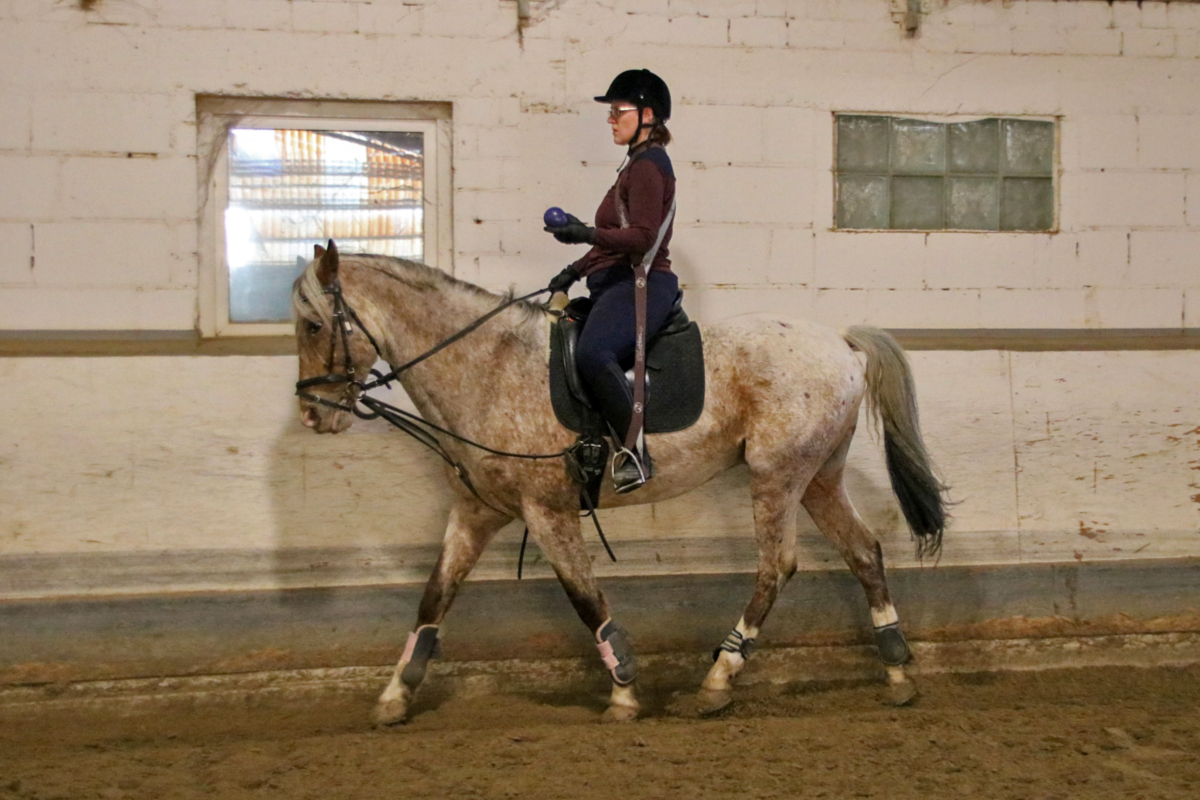 So mussten Teilnehmer, die sonst eher auf einem bequem zu sitzenden Pferd unterwegs sind, auf einen schwungvolleren Pferderücken "umsteigen", und wer sich sonst eher triebigere Pferde aussucht und lieber ein wenig langsamer unterwegs ist, wurde auf ein eher flottes Pferd gesetzt. Nach anfänglicher Skepsis sorgte das vor allem für eins: Für begeisterte Teilnehmer, die aus ihrer jeweiligen Einzelstunde wirklich viel mitnehmen konnten. Dabei gab es nicht nur jede Menge HIlfsmittel auszuprobieren, denn Anette hatte einen ganzen Korb voller Schwämme, Bälle und Elastikbänder dabei, die für ganz unterschiedliche Zwecke eingesetzt werden können (und auch eingesetzt wurden): Auch der Balimo-Hocker kam zum Einsatz, vor allem aber gab es im Einzelunterricht jede Menge Tipps für besseres Reiten.