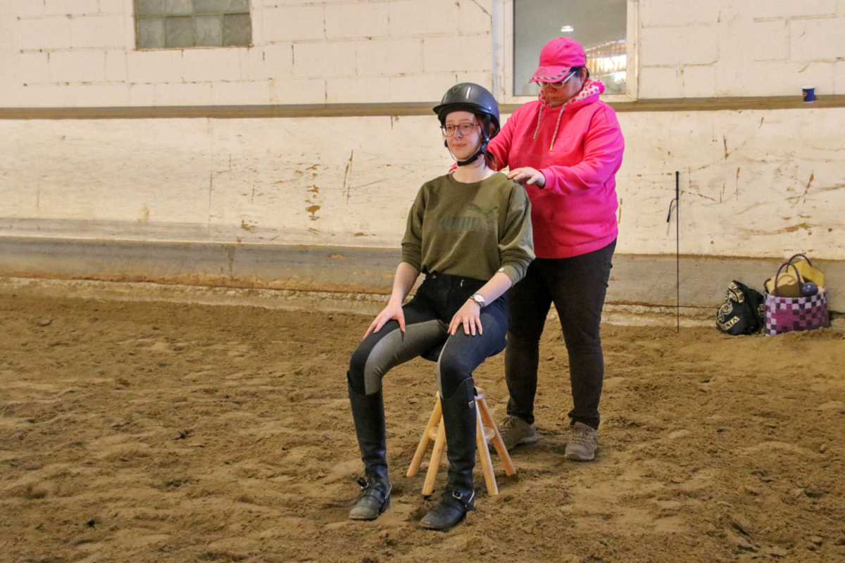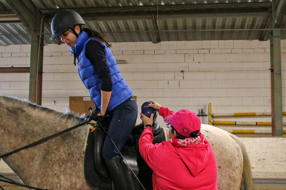 Davon profitierten auch die Teilnehmer, die schon häufiger an den Einzelstunden von Anette teilgenommen hatten, die schon lange reiten (und schon sehr gut sitzen) und die eigentlich gar nicht mehr viele Hilfsmittel nötig hatten, um die Hände ruhig zu halten, die Beine an der richtigen Stelle des Pferdebauchs anzulegen oder aufrecht im Sattel zu sitzen. Manche Teilnehmer, die schon früher am Kurs teilgenommen hatten, hatten für den Einsatz von Schwämmen und Bällen besondere Wünsche mitgebracht, andere schilderten die Sitzprobleme, auf die sie selbst in ihren letzten Reitstunden aufmerksam geworden waren. Wie schon in den vergangenen Kursen schaute sich Anette dennoch jede Pferd-Reiter-Kombination erst einmal einige Minuten beim Aufwärmen in verschiedenen Gangarten an, um dann zu entscheiden, wie sie die Einzelstunde aufbauen würde.
