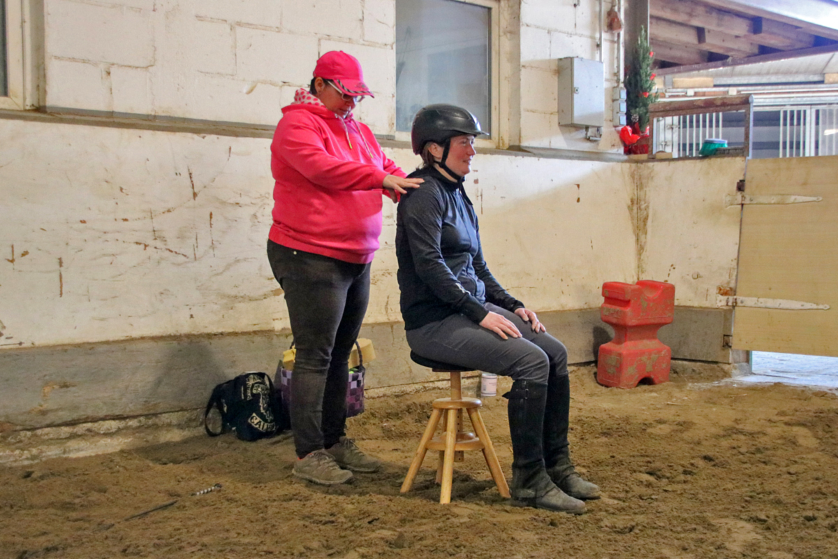 Ganz kurz sah es so aus, als müsse die "Sitzschule nach der Franklin-Methode" mit Anette Jung ganz kurzfristig ausfallen: Am Samstagnachmittag hatte sich die Kursleiterin in einem anderen Stall bei einem Unfall verletzt. Am Sonntagmorgen stand sie trotzdem in unserer Reithalle: Selbst ausnahmsweise eher unbeweglich, vermittelte sie mit Bällen, Schwämmen und Bändern neun Reitschülern mehr Beweglichkeit und einen besseren Sitz.