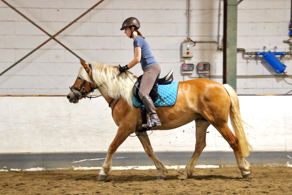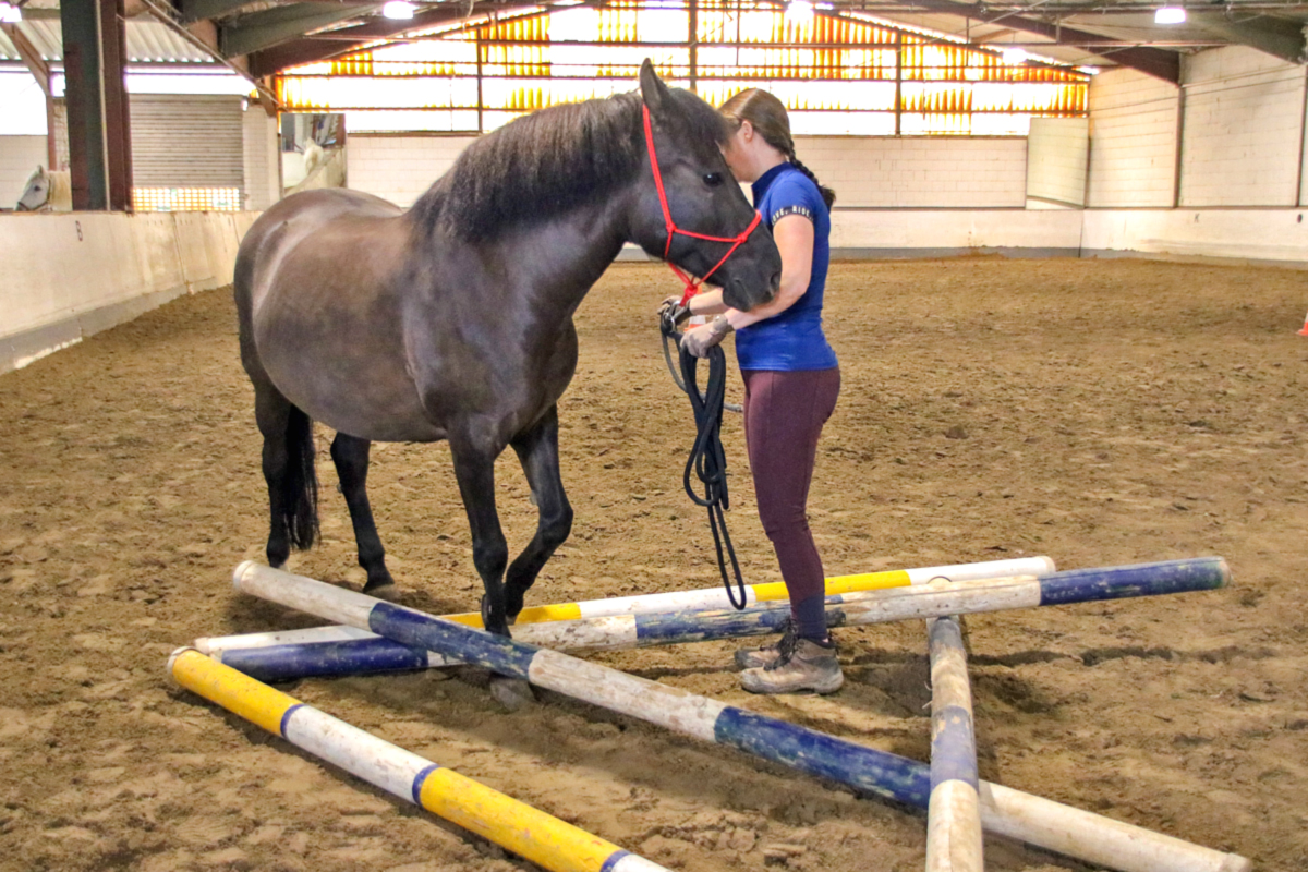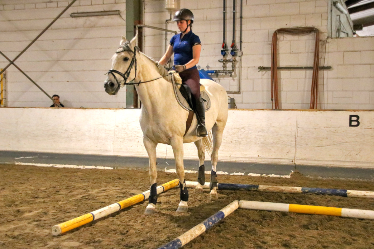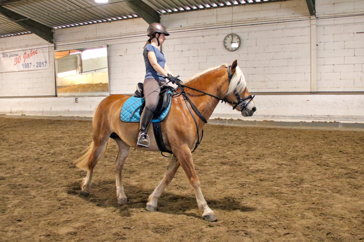 Unser Schulpony Oliver war dann noch einmal am Boden unterwegs - mit ihm kam eine Teilnehmerin in die Halle, die uns zum allerersten Mal besuchte. Sie hatte ihre Kursteilnahme als Nicht-Mitglied gebucht und eine lange Anfahrt hinter sich gebracht, um die Arbeit mit der Doppellonge zu üben. Auch Oliver ist darin ein richtiger Profi, so dass sie viel mitnehmen konnte nach Hause - in ihren eigenen Stall, wo sie mit ihrem eigenen Pferd gern künftig auch an solchen Aufgaben arbeiten möchte. Den Abschluss des Kurses bildeten Belle und Riko mit ihren jeweiligen Reiterinnen - und auch hier wurde an individuellen Problemen und Herausforderungen von Pferd und Reiter gearbeitet.