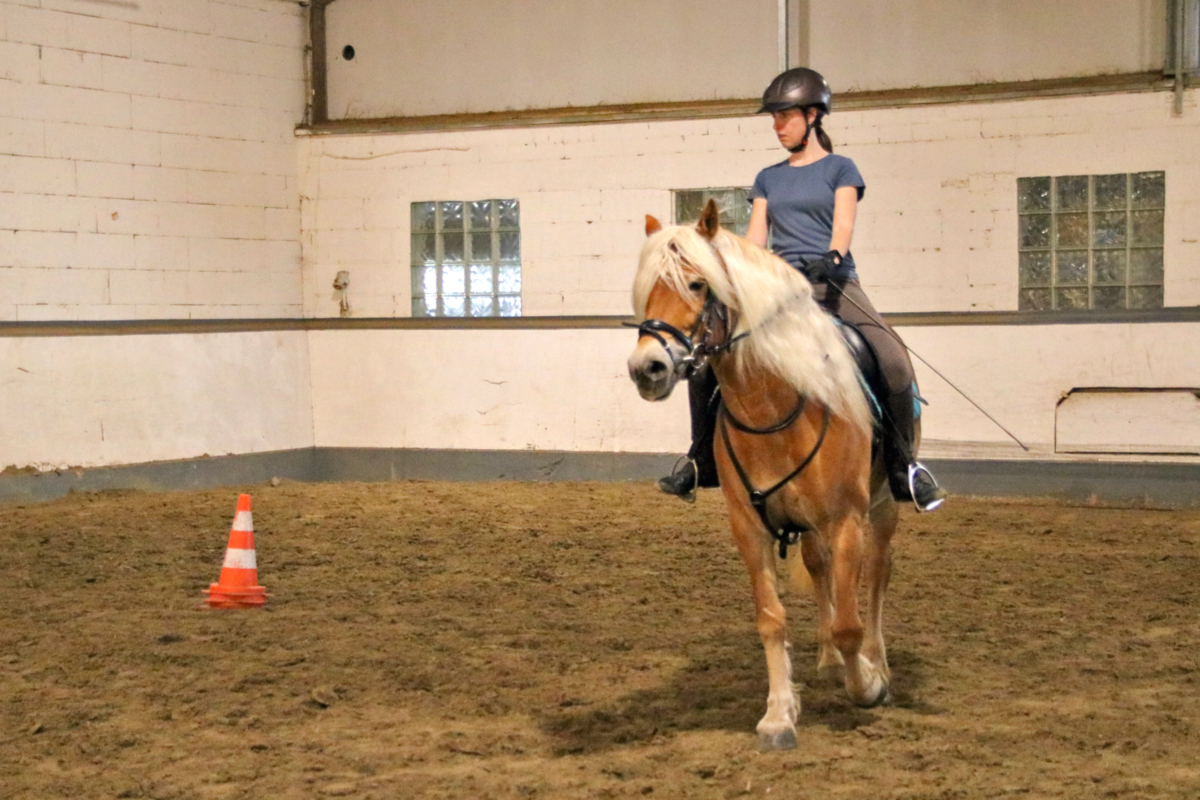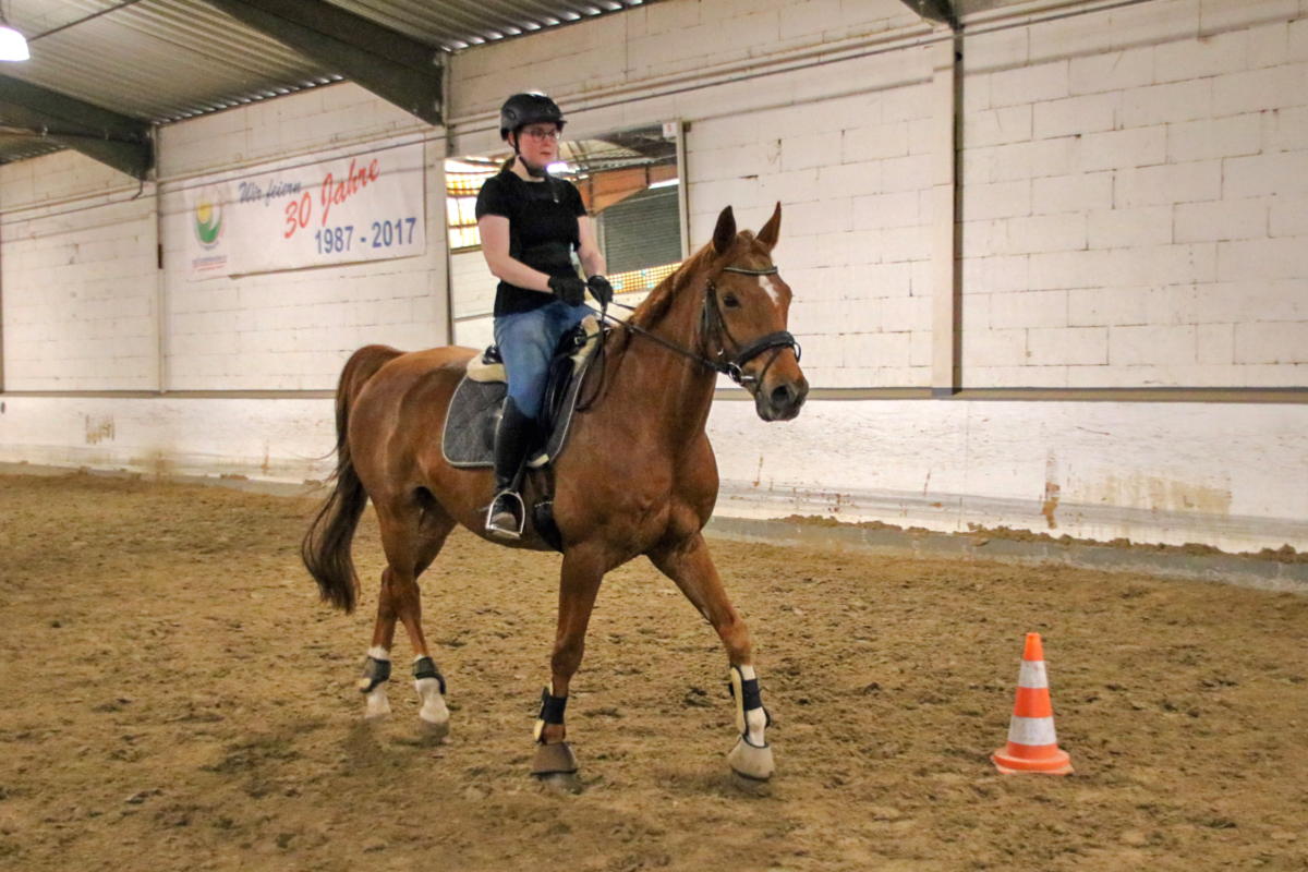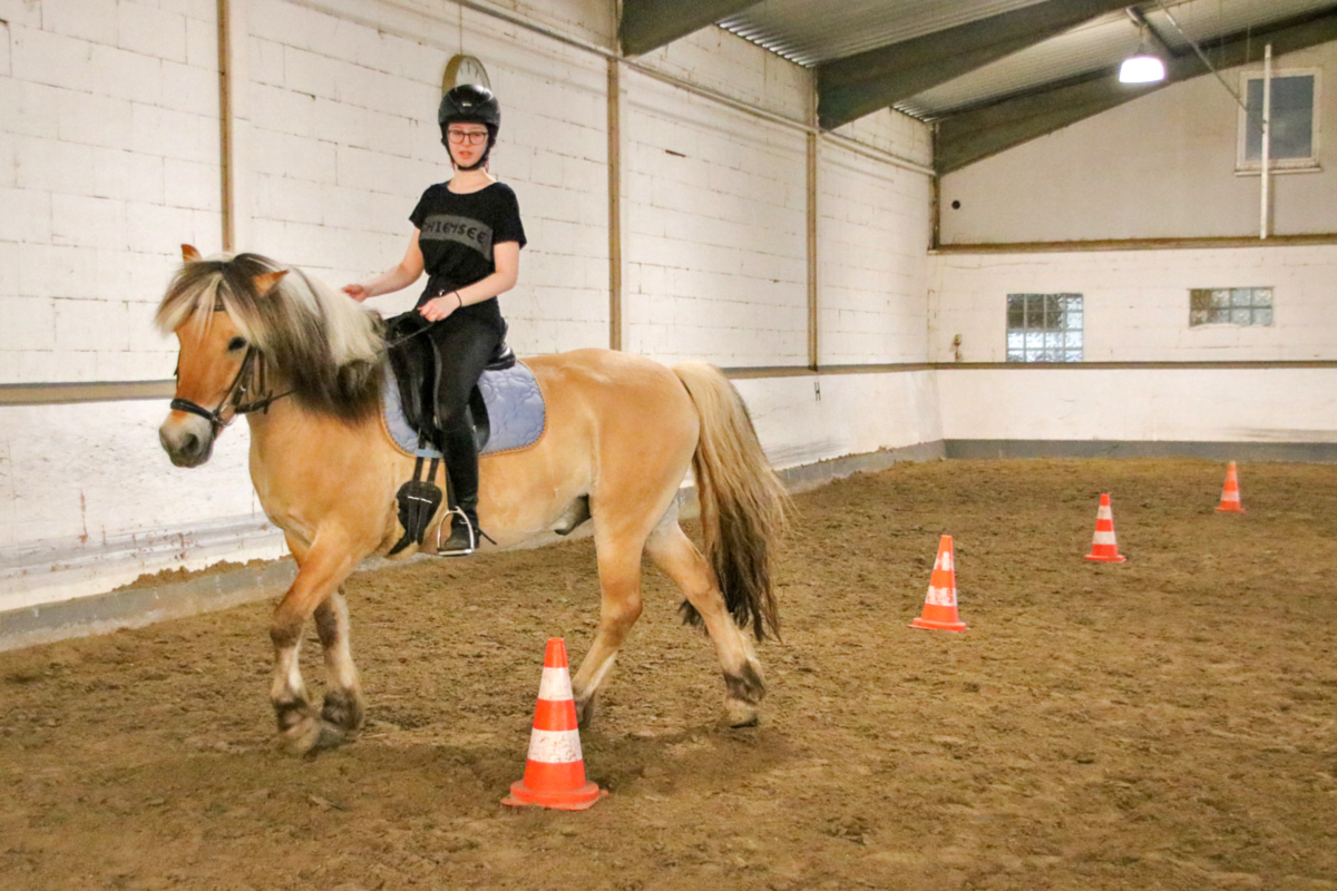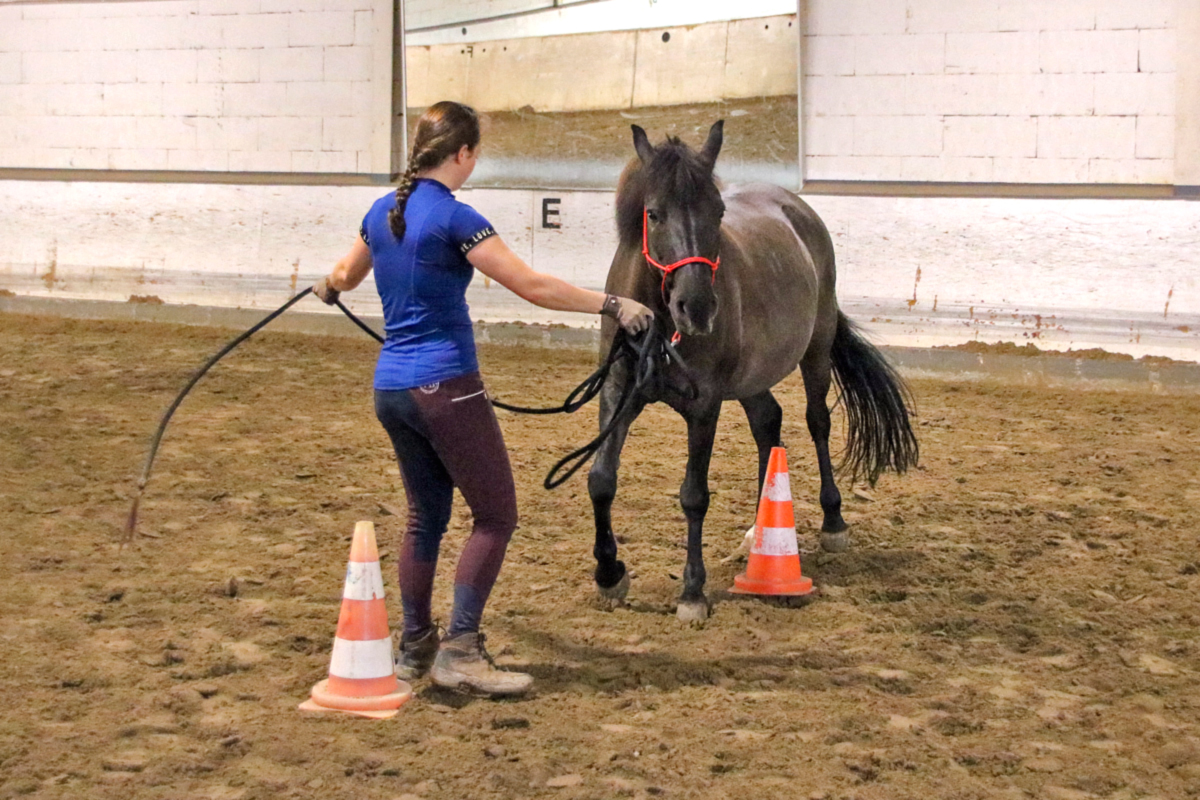 Für unser Schulpferd Efenia stand im Anschluss ebenfalls Bodenarbeit auf dem Programm. Ihre zweibeinige Begleitung hatte zum ersten Mal einen Lehrgang bei uns gebucht: Als relativ neues Vereinsmitglied hatte sie bislang nur an den wöchentlichen Reitstunden teilgenommen, sich dort aber schon mit Efenia angefreundet. Um viele neue Erkenntnisse reicher ging es dann für alle Zwei- und Vierbeiner erst mal in die wohlverdiente Mittagspause, bevor dann die erste Reiterin in den Sattel stieg: Auf unser Schulpony Vin und im Anschluss dann auch für unser Schulpferd Niva (und ihre beiden Reiterinnen) warteten anstrengende Reitstunden. Dabei wurde ganz individuell an verschiedenen Themen gearbeitet - während Vin eher in Richtung Dressur unterwegs war, lösten Niva und ihre Reiterin einige Aufgaben, die eher in Richtung Working Equitation gingen. Beides hatte letztendlich aber das gleiche Ziel: motivierte und lockere Pferde, die eigenständig mitarbeiten - und Zwei- und Vierbeiner, die nach ihrer Stunde gleichermaßen müde sind.
