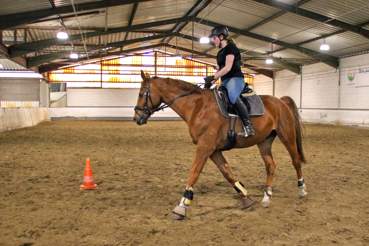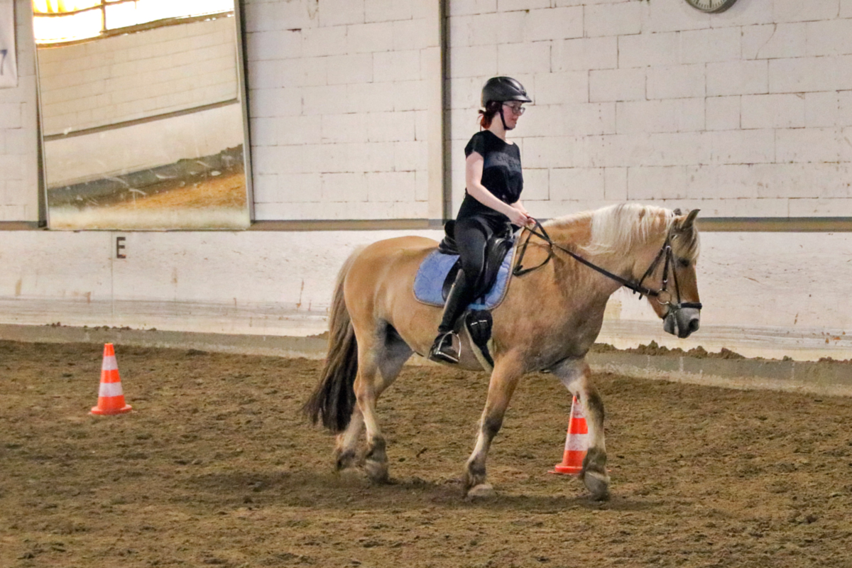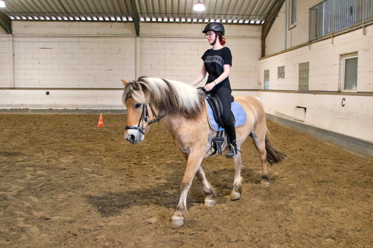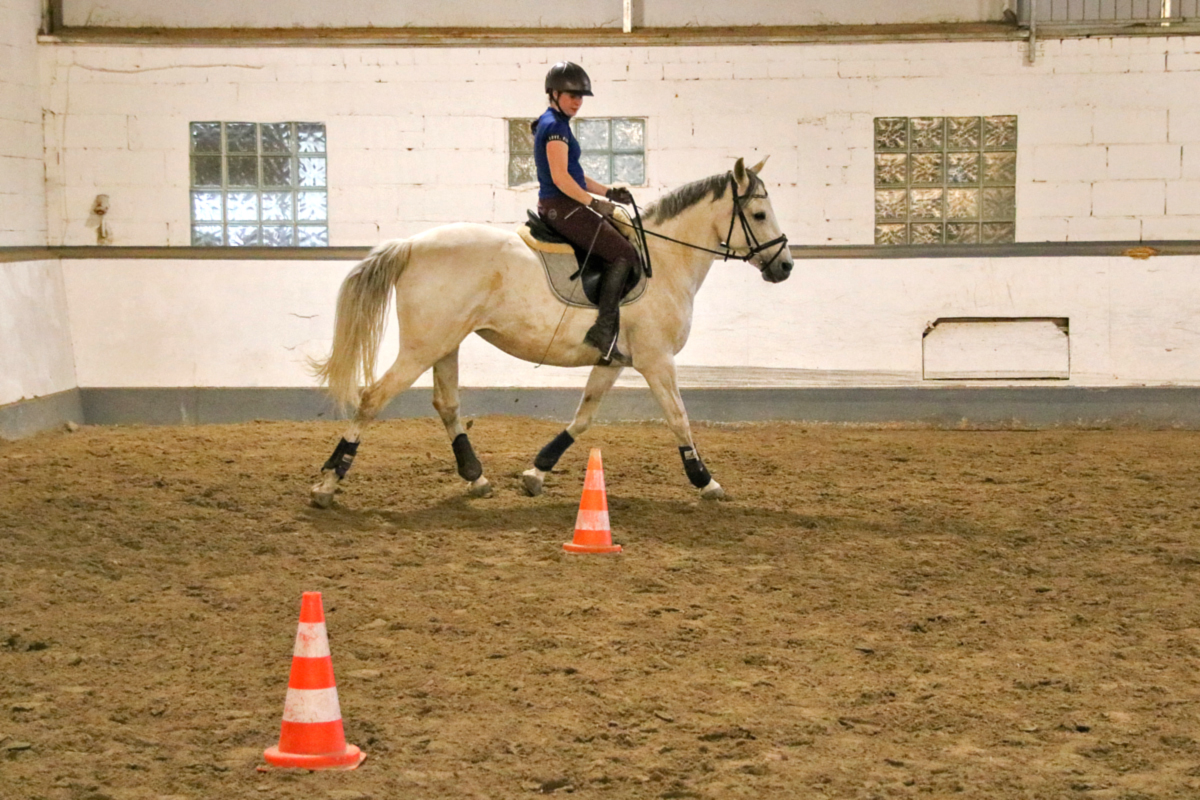 Für unser Schulpferd Efenia stand im Anschluss ebenfalls Bodenarbeit auf dem Programm. Ihre zweibeinige Begleitung hatte zum ersten Mal einen Lehrgang bei uns gebucht: Als relativ neues Vereinsmitglied hatte sie bislang nur an den wöchentlichen Reitstunden teilgenommen, sich dort aber schon mit Efenia angefreundet. Um viele neue Erkenntnisse reicher ging es dann für alle Zwei- und Vierbeiner erst mal in die wohlverdiente Mittagspause, bevor dann die erste Reiterin in den Sattel stieg: Auf unser Schulpony Vin und im Anschluss dann auch für unser Schulpferd Niva (und ihre beiden Reiterinnen) warteten anstrengende Reitstunden. Dabei wurde ganz individuell an verschiedenen Themen gearbeitet - während Vin eher in Richtung Dressur unterwegs war, lösten Niva und ihre Reiterin einige Aufgaben, die eher in Richtung Working Equitation gingen. Beides hatte letztendlich aber das gleiche Ziel: motivierte und lockere Pferde, die eigenständig mitarbeiten - und Zwei- und Vierbeiner, die nach ihrer Stunde gleichermaßen müde sind.