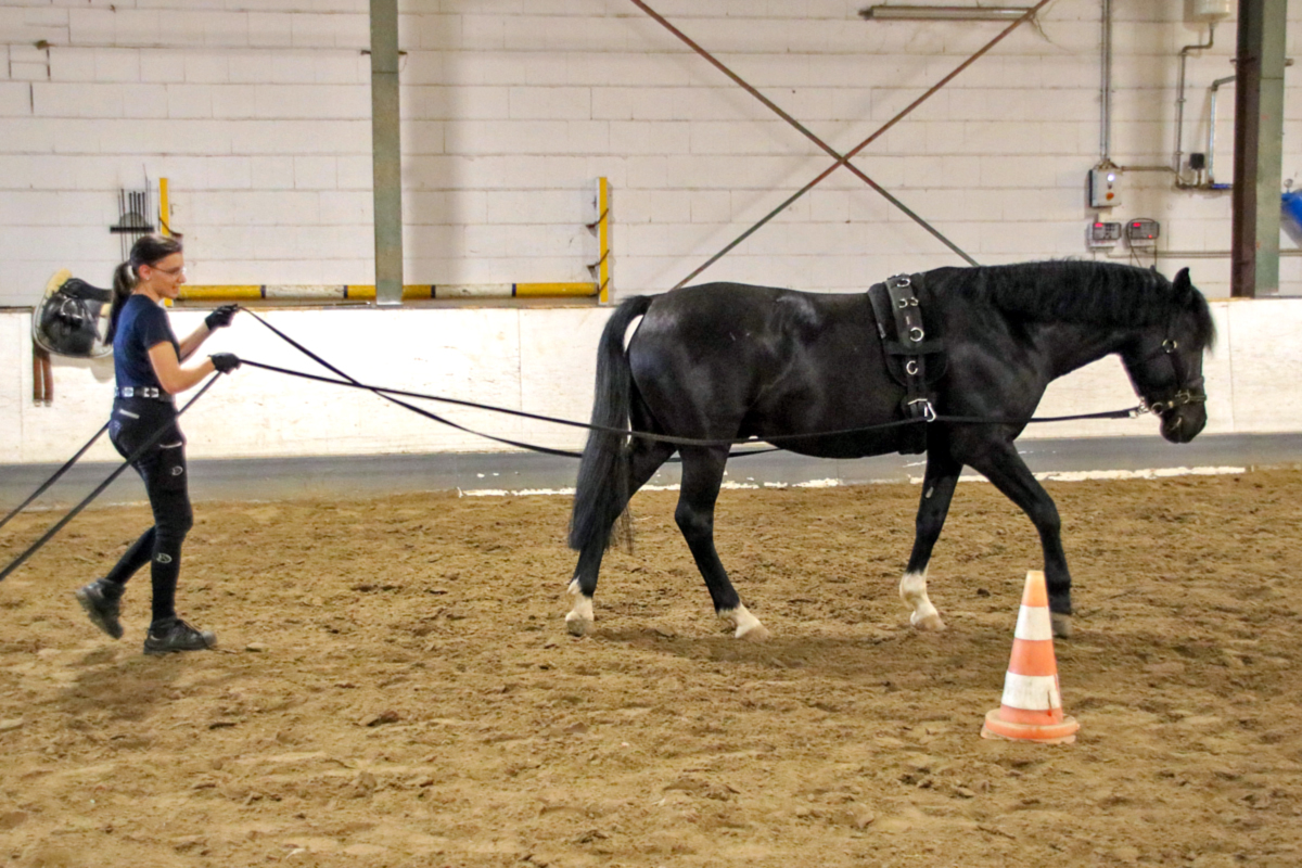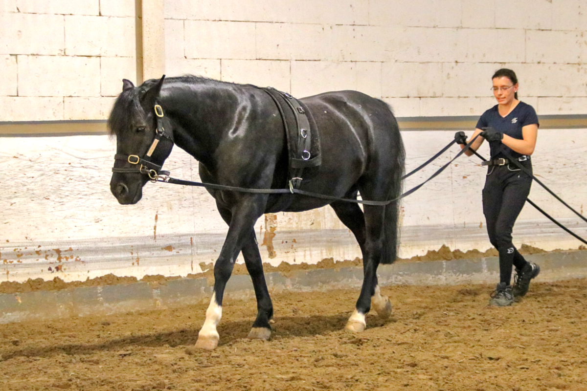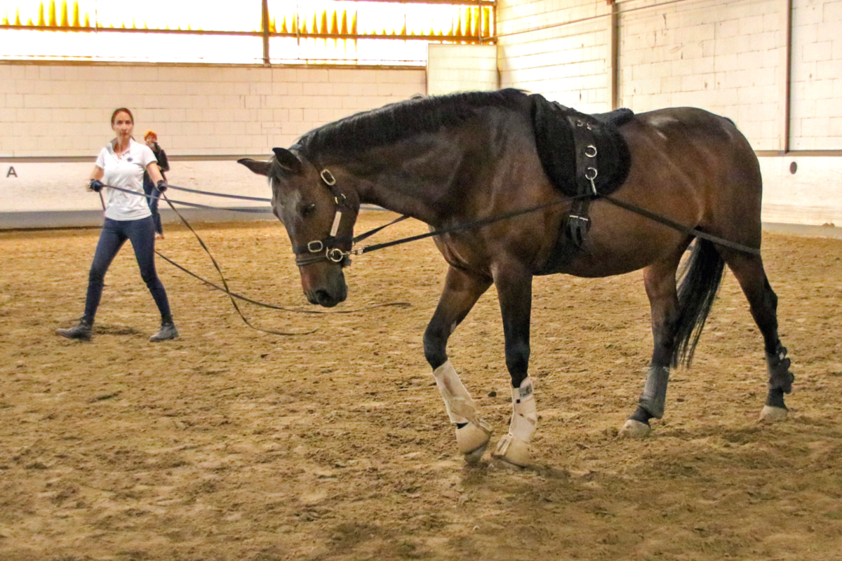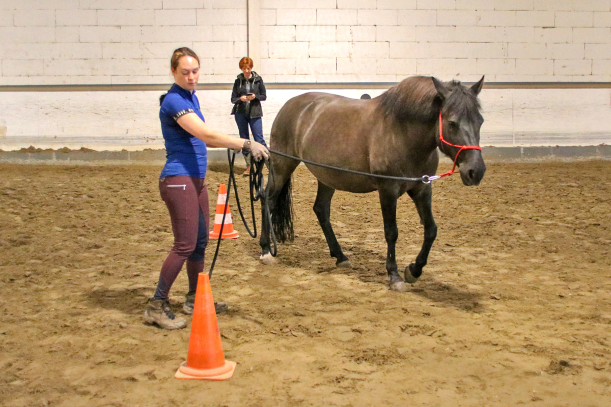 Auch die nächste Teilnehmerin stieg nicht in den Sattel: Sie hatte sich für die Arbeit mit der Doppellonge entschieden und kam dafür mit unserem Schulpferd Rueda in die Halle. Während der Zweibeiner noch gar keine Erfahrung mit den beiden Longen hatte, ist Rueda darin richtiger Profi - und so dauerte es nicht lang, bis auch Hand- und Richtungswechsel und das Traben problemlos klappten. Dabei musste die Teilnehmerin feststellen, was Anja schon vorausgesagt hatte: Die Arbeit mit der Doppellonge ist eigentlich eine optimale Disziplin für kalte Wintertage - denn wenn man die Möglichkeiten nutzt, die die Doppellonge bietet, dann ist auch der Zweibeiner ziemlich viel zu Fuß unterwegs und es wird ordentlich warm.