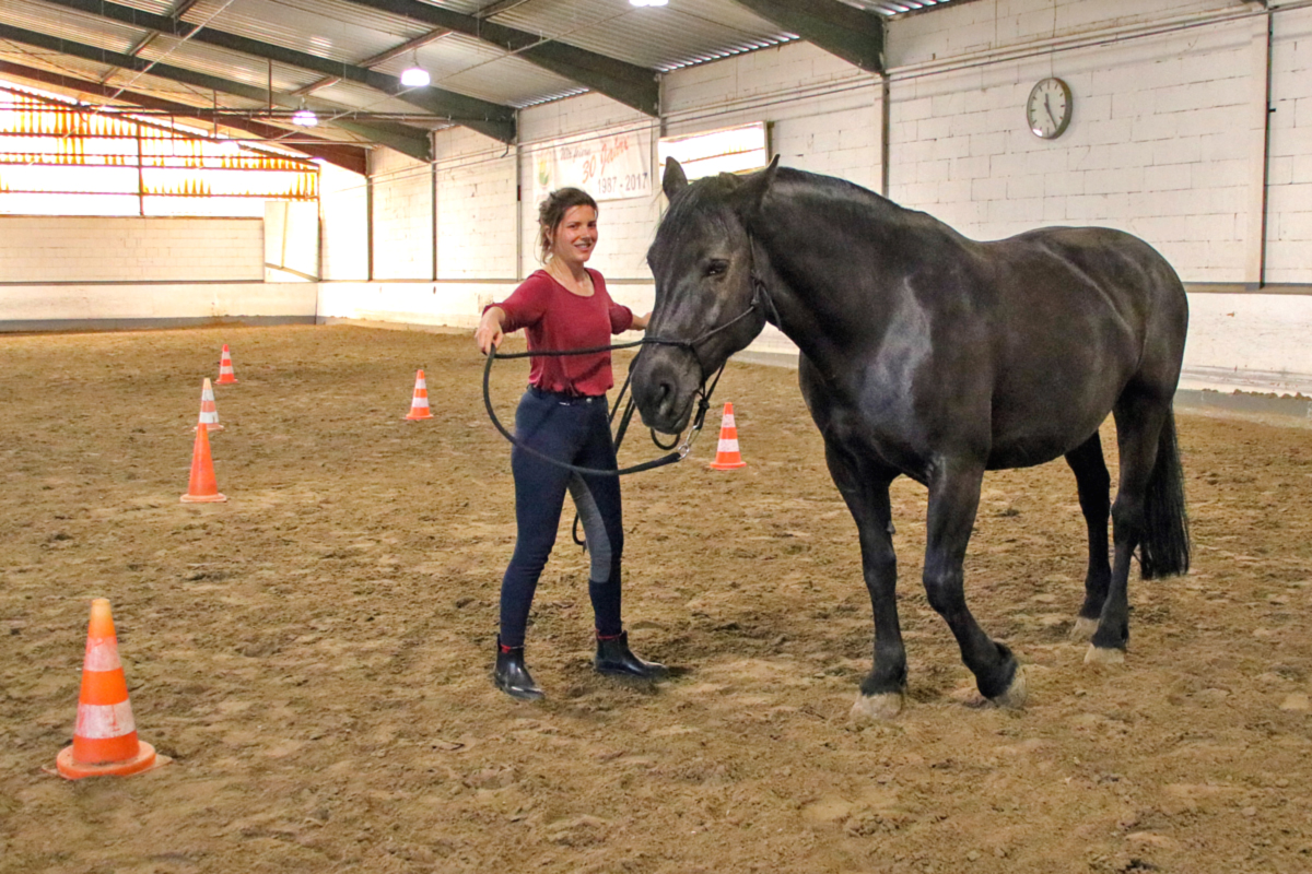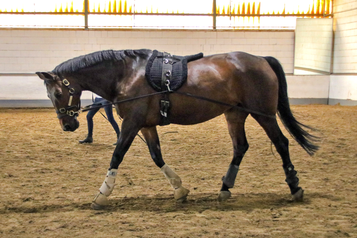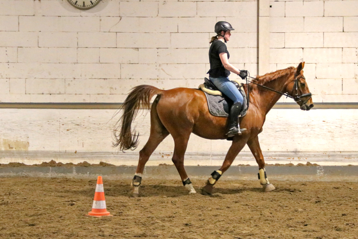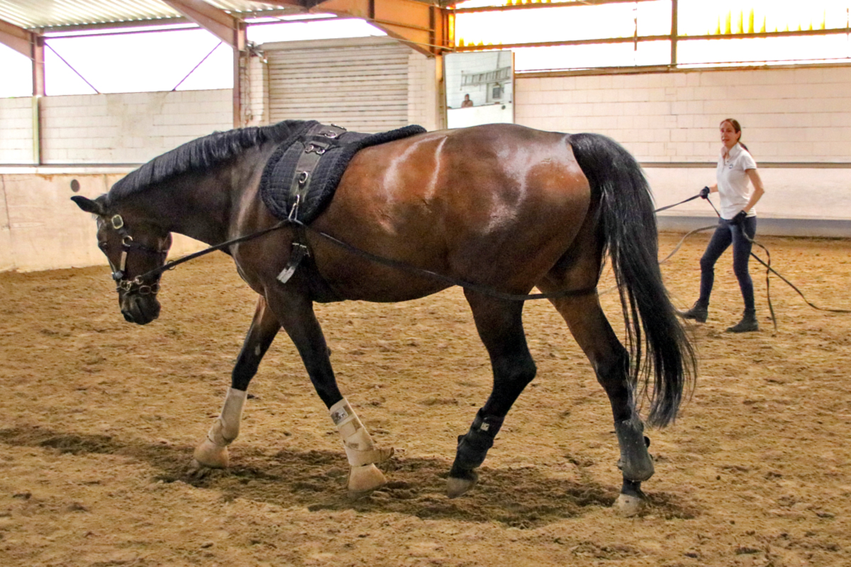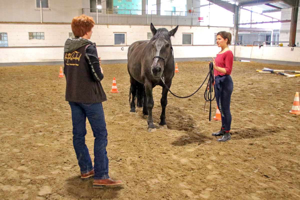 Auch die nächste Teilnehmerin stieg nicht in den Sattel: Sie hatte sich für die Arbeit mit der Doppellonge entschieden und kam dafür mit unserem Schulpferd Rueda in die Halle. Während der Zweibeiner noch gar keine Erfahrung mit den beiden Longen hatte, ist Rueda darin richtiger Profi - und so dauerte es nicht lang, bis auch Hand- und Richtungswechsel und das Traben problemlos klappten. Dabei musste die Teilnehmerin feststellen, was Anja schon vorausgesagt hatte: Die Arbeit mit der Doppellonge ist eigentlich eine optimale Disziplin für kalte Wintertage - denn wenn man die Möglichkeiten nutzt, die die Doppellonge bietet, dann ist auch der Zweibeiner ziemlich viel zu Fuß unterwegs und es wird ordentlich warm.
